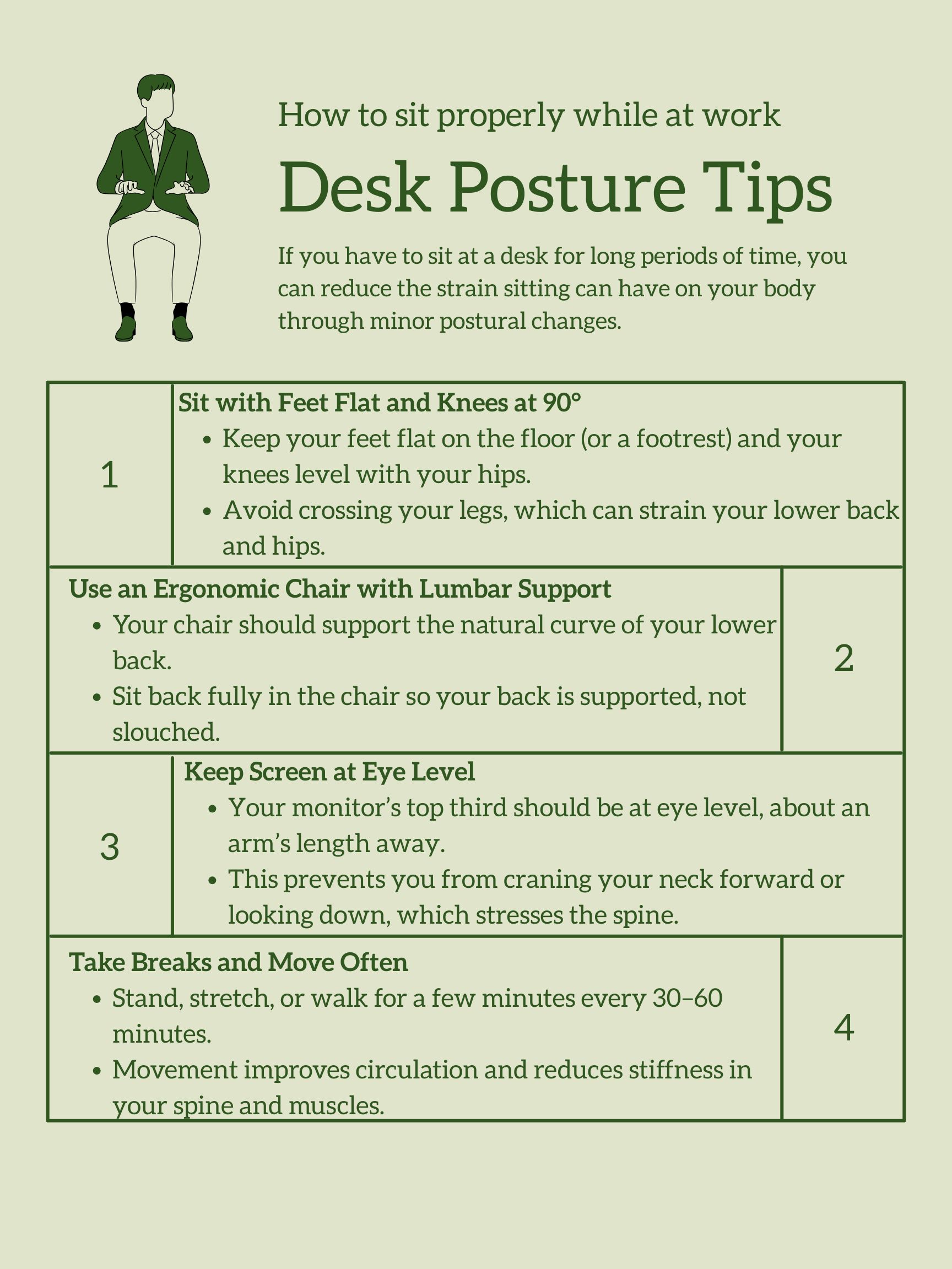 - Check your workspace ergonomics – Make sure your chair, desk, and monitor encourage upright posture.
